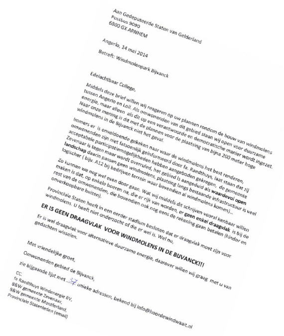 De "Boze Bijvanck" hield verder een beleefde en bescheiden actie naar de leden van Provinciale Staten. Ieder lid ontving een email en een telefoontje van de omwonenden. Daar werd door de Statenleden meestal positief op gereageerd. Of ze nu snappen dat het niet alleen een Nimby-actie is (liever niet bij ons), maar dat het een top-down vernietigen is van ons Gelders open Landschap? We zullen ze nog maar eens mailen, want de fuik van Omgevingsvisie en Windvisie staat voor hen open !